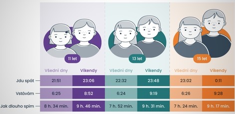 U českých dětí a teenagerů dochází k postupnému zkracování délky spánku. Ve všední dny věnují spánku v průměru 7 hodin a 57 minut. Od posledního sběru dat v roce 2018 se délka spánku dětí ve věku 11–15 let zkrátila o 11 minut. Ve srovnání s národními daty z roku 2014 je rozdíl už více než 20minutový. Každý druhý školák (49 %) tak spí méně, než je doporučeno. V roce 2014 přitom do této skupiny patřilo pouze 35 % školáků.