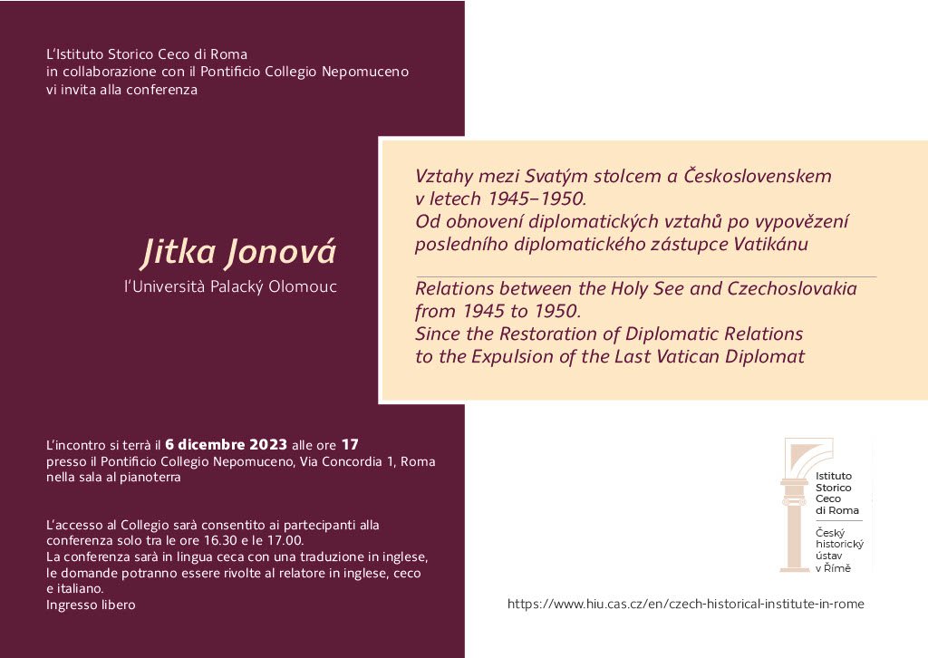 V prostorách Papežské koleje Nepomucenum v Římě vystoupila 6. prosince 2023 akademička z Cyrilometodějské teologické fakulty UP doc. Jitka Jonová s přednáškou Vztahy mezi Svatým stolcem a Československem v letech 1945–1950. Od obnovení diplomatických vztahů po vypovězení posledního diplomatického zástupce Vatikánu. Přednášku zaštítilo Velvyslanectví České republiky při Svatém stolci.