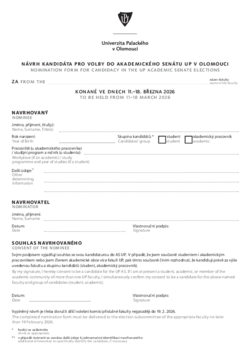 Písemný návrh na odkazovaném návrhovém formuláři se předkládá předsedovi dílčí volební komise do 19. února 2026 včetně. O vašem podaném písemném návrhu ho informujte také emailem. Přesné pokyny jsou rozepsány v článku 5 Volebního řádu Akademického senátu Univerzity Palackého v Olomouci (vnitřní předpis UP A-4/2017-ÚZ02).